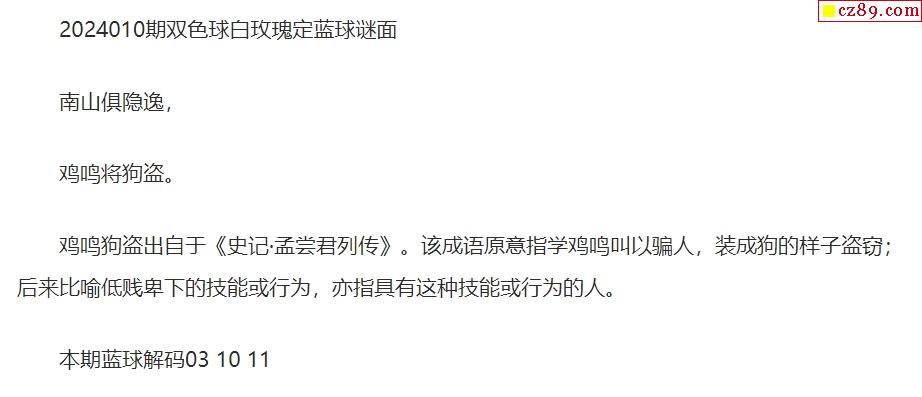 24年福彩双色球010期 白玫瑰定蓝球字谜